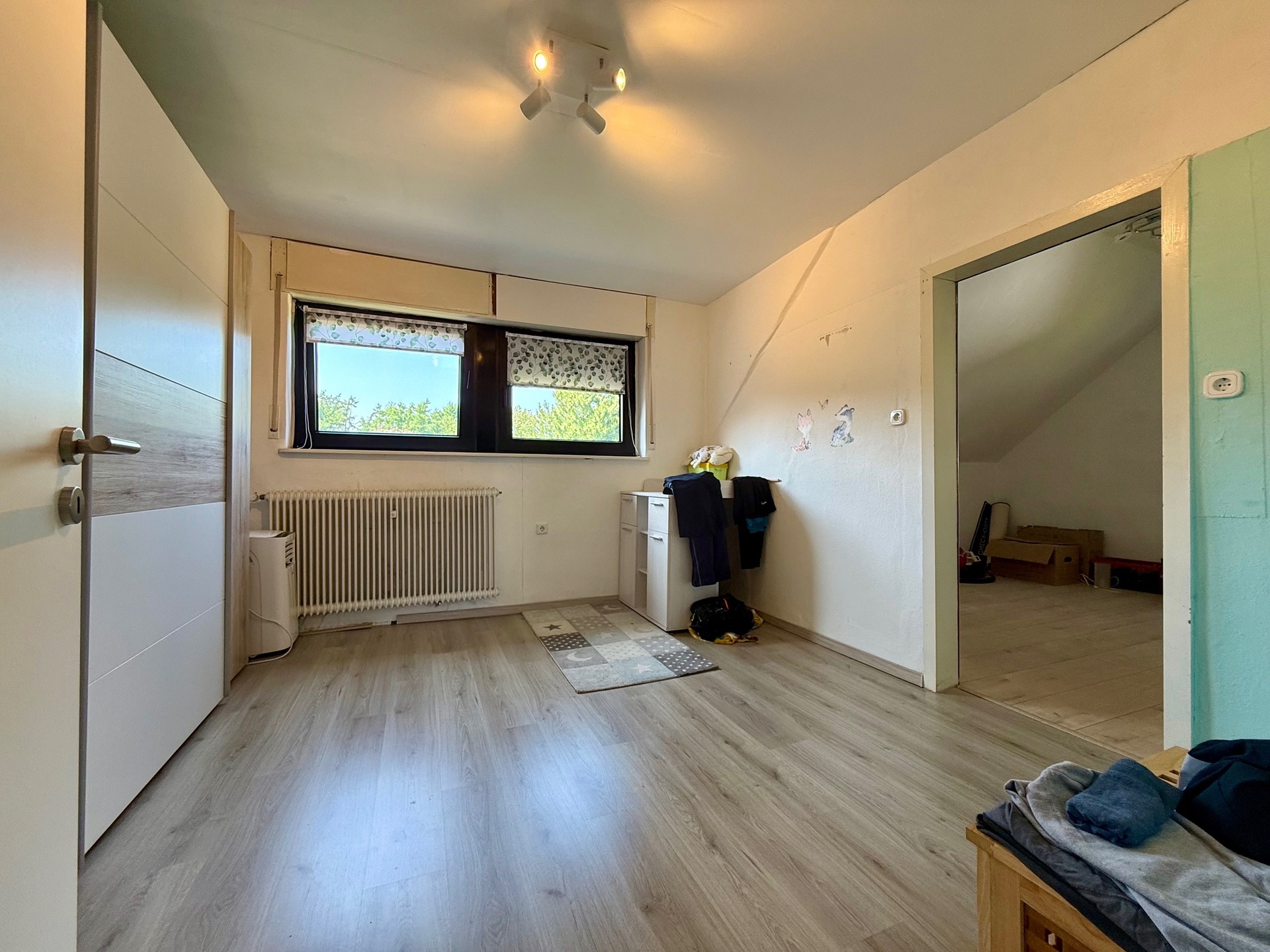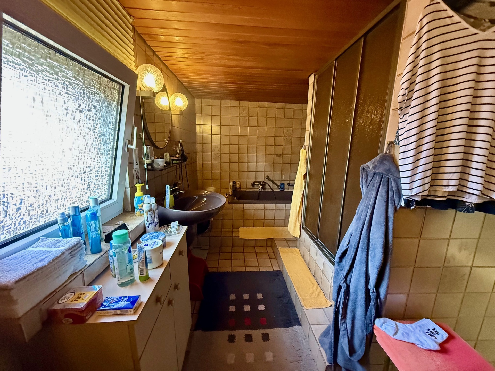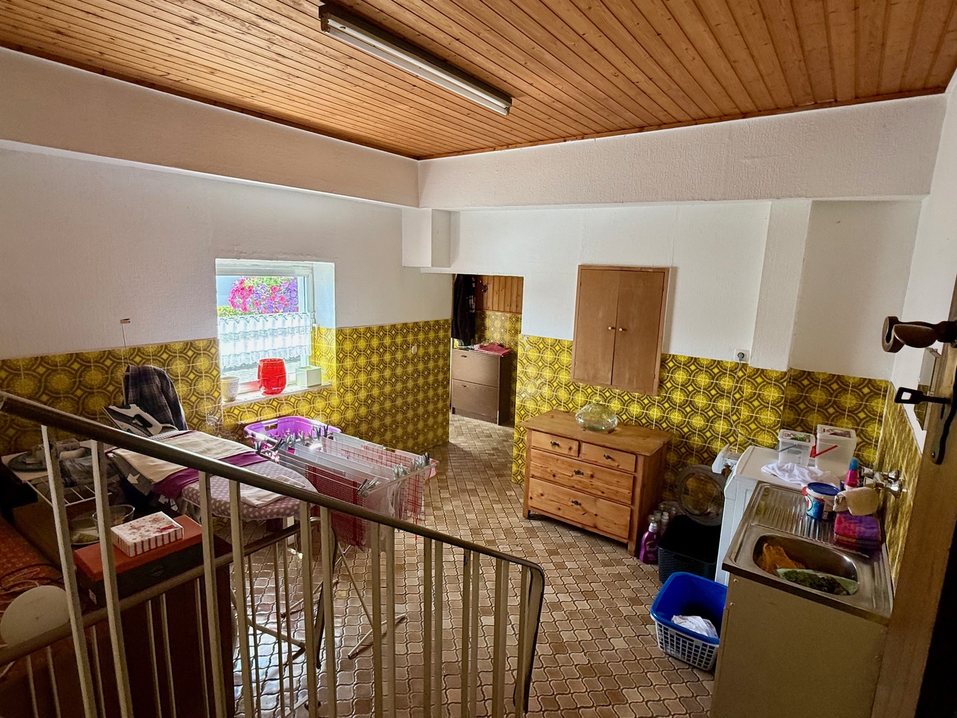 Komplettiert wird die Etage mit einem weiteren Zimmer (z. Zt. Schlafraum, den wir aus Gründen der Diskretion bildlich nicht veröffentlicht haben!), einem großräumigen Hauswirtschaftsraum zum Waschen/Trocknen sowie zwei Bädern, ein Gäste-WC sowie weitere Verstauflächen. Eines der beiden Bäder präsentiert sich optisch bereits zeitgemäß, das andere erinnert eher an den Look der 1970er-Jahre. Beide Bäder sind mit Fenstern sowie Wanne und separater Dusche ausgestattet.