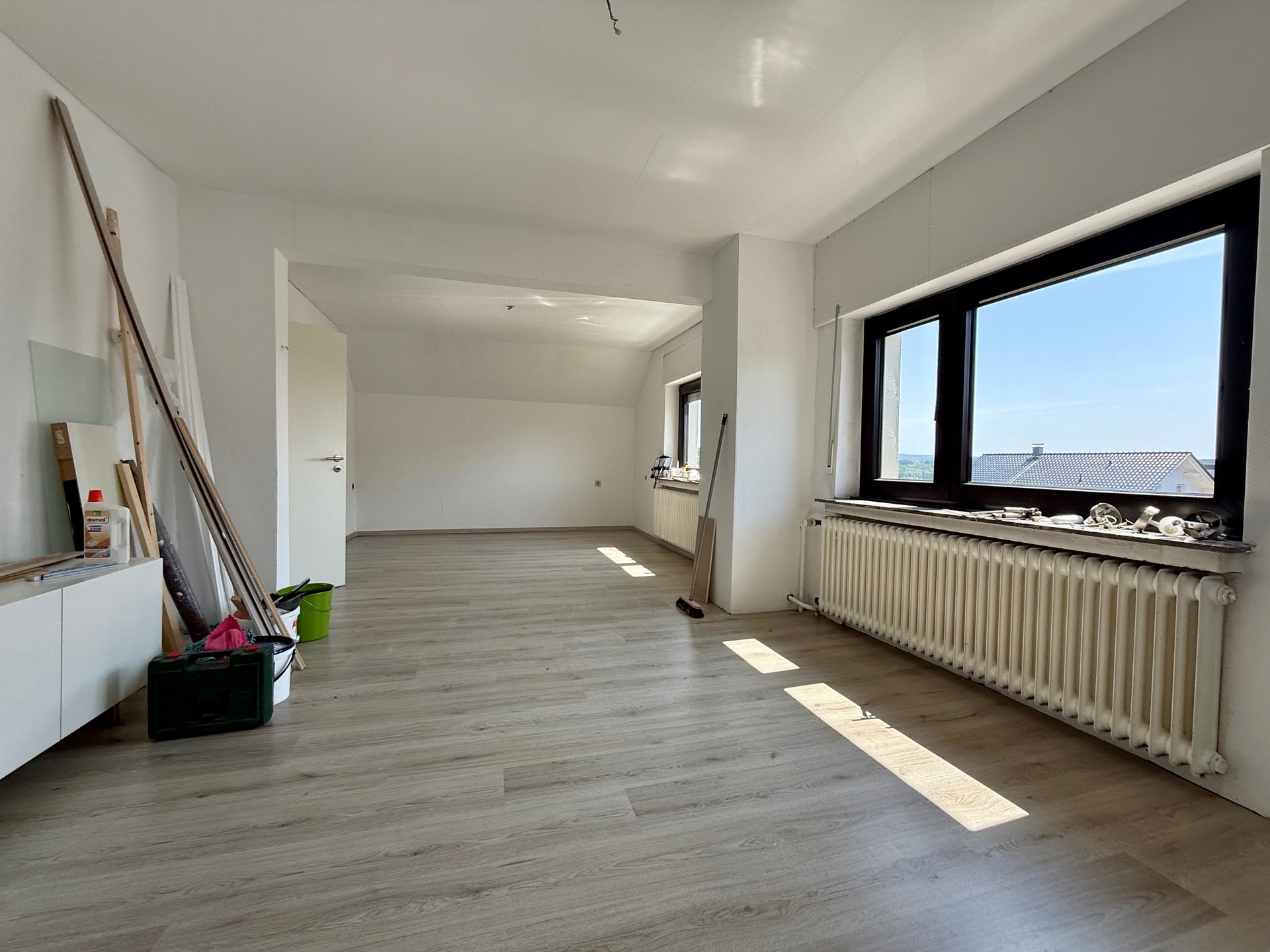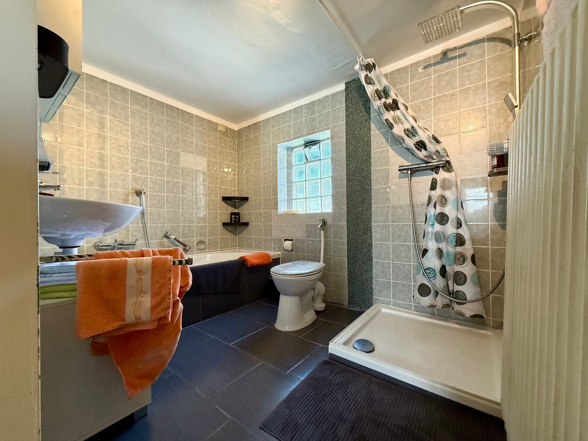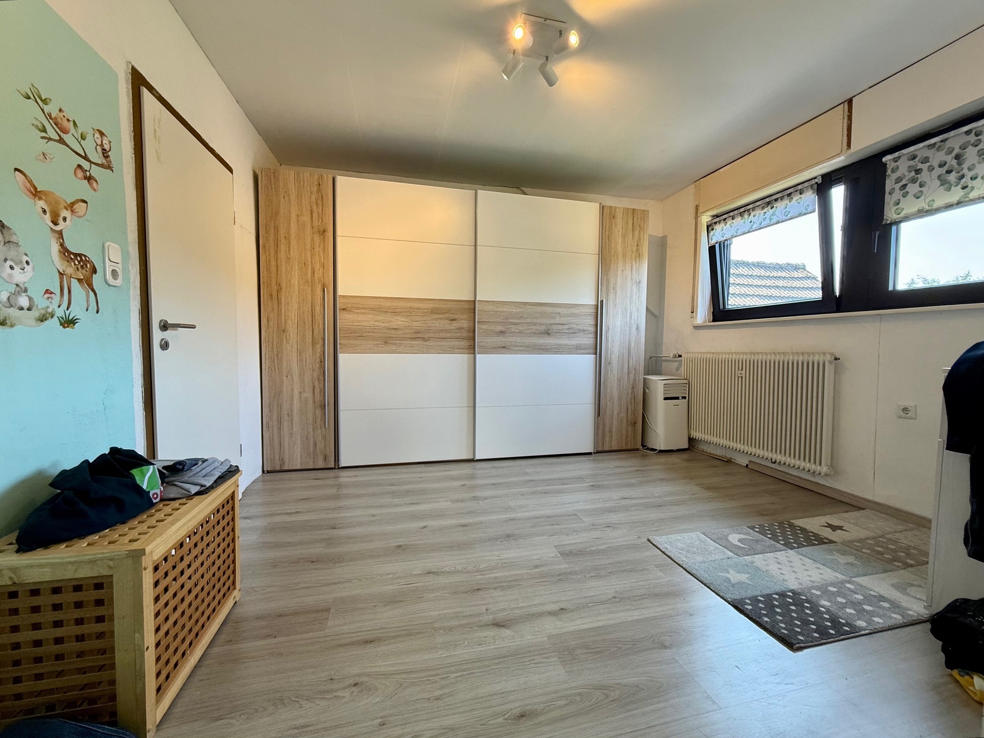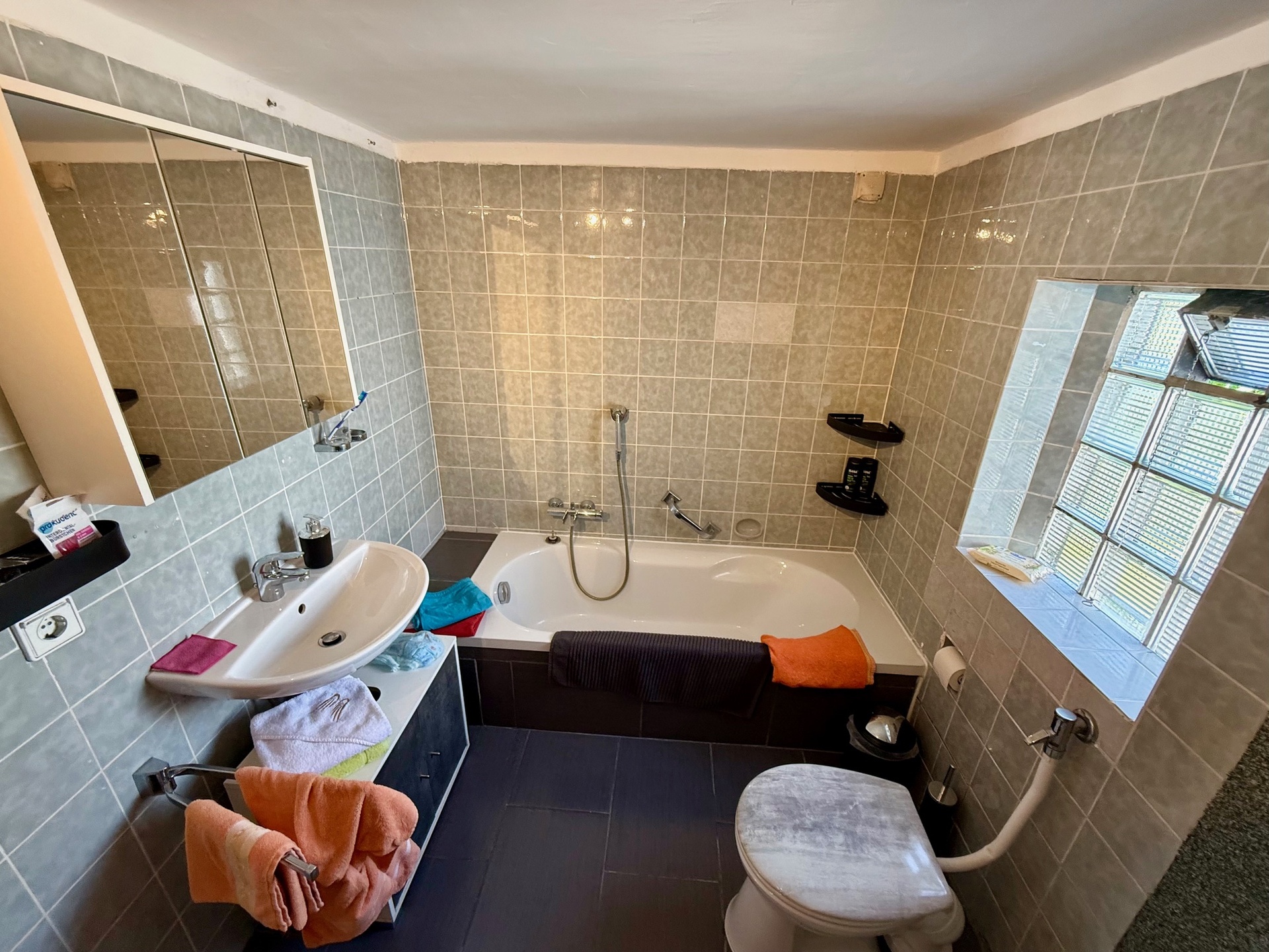 Komplettiert wird die Etage mit einem weiteren Zimmer (z. Zt. Schlafraum, den wir aus Gründen der Diskretion bildlich nicht veröffentlicht haben!), einem großräumigen Hauswirtschaftsraum zum Waschen/Trocknen sowie zwei Bädern, ein Gäste-WC sowie weitere Verstauflächen. Eines der beiden Bäder präsentiert sich optisch bereits zeitgemäß, das andere erinnert eher an den Look der 1970er-Jahre. Beide Bäder sind mit Fenstern sowie Wanne und separater Dusche ausgestattet.