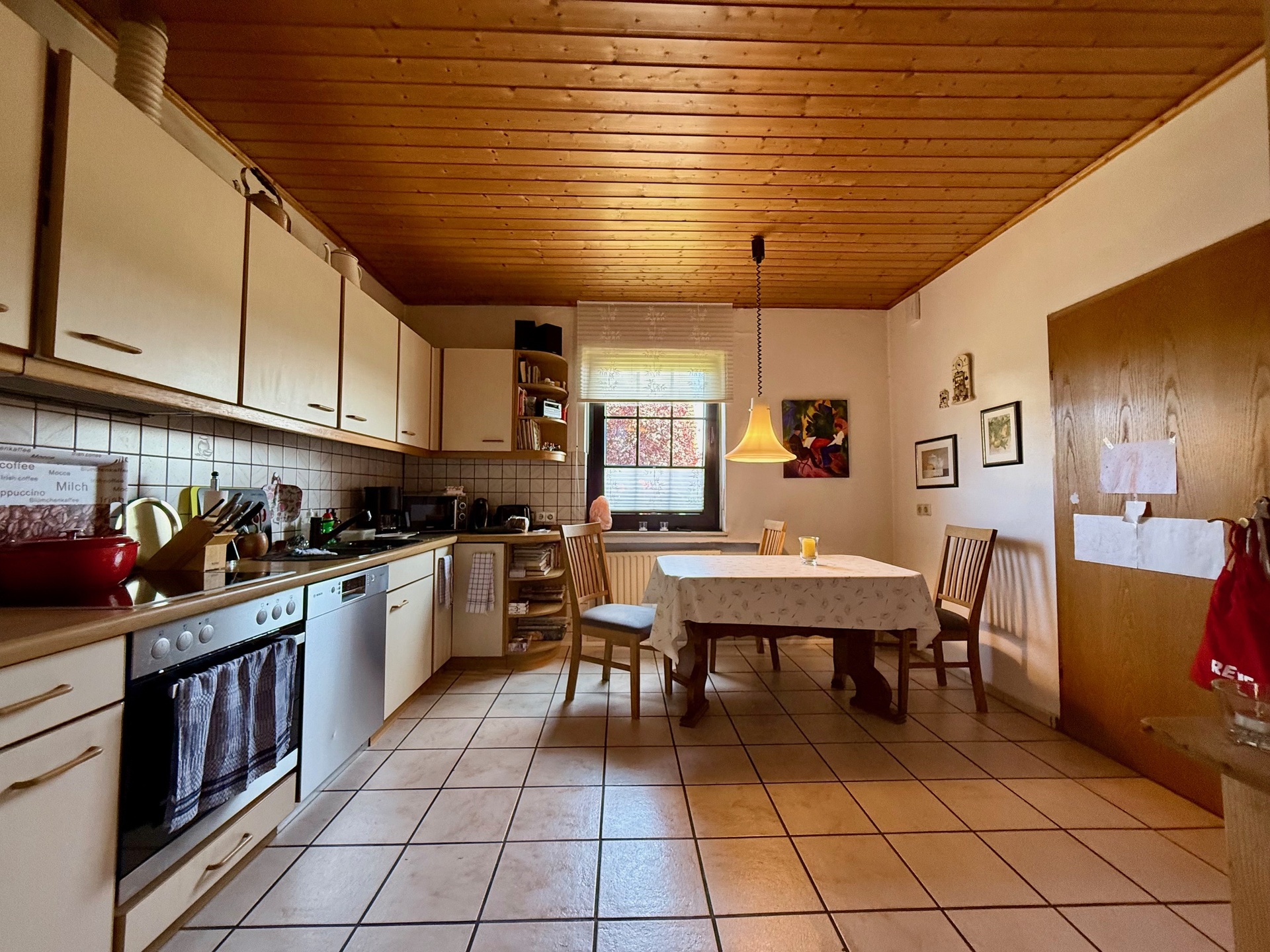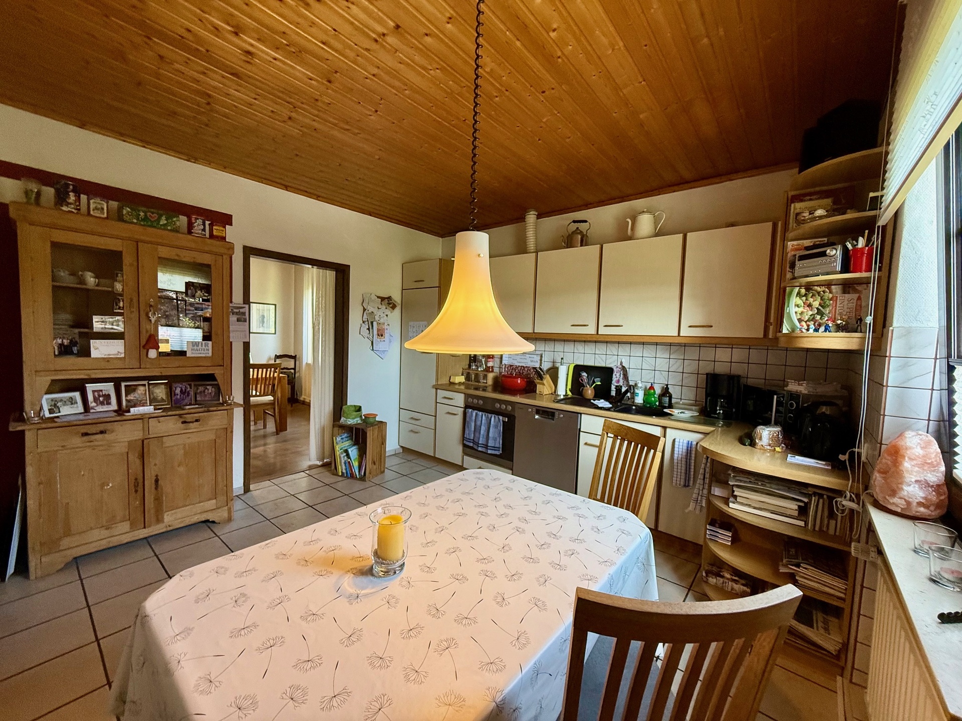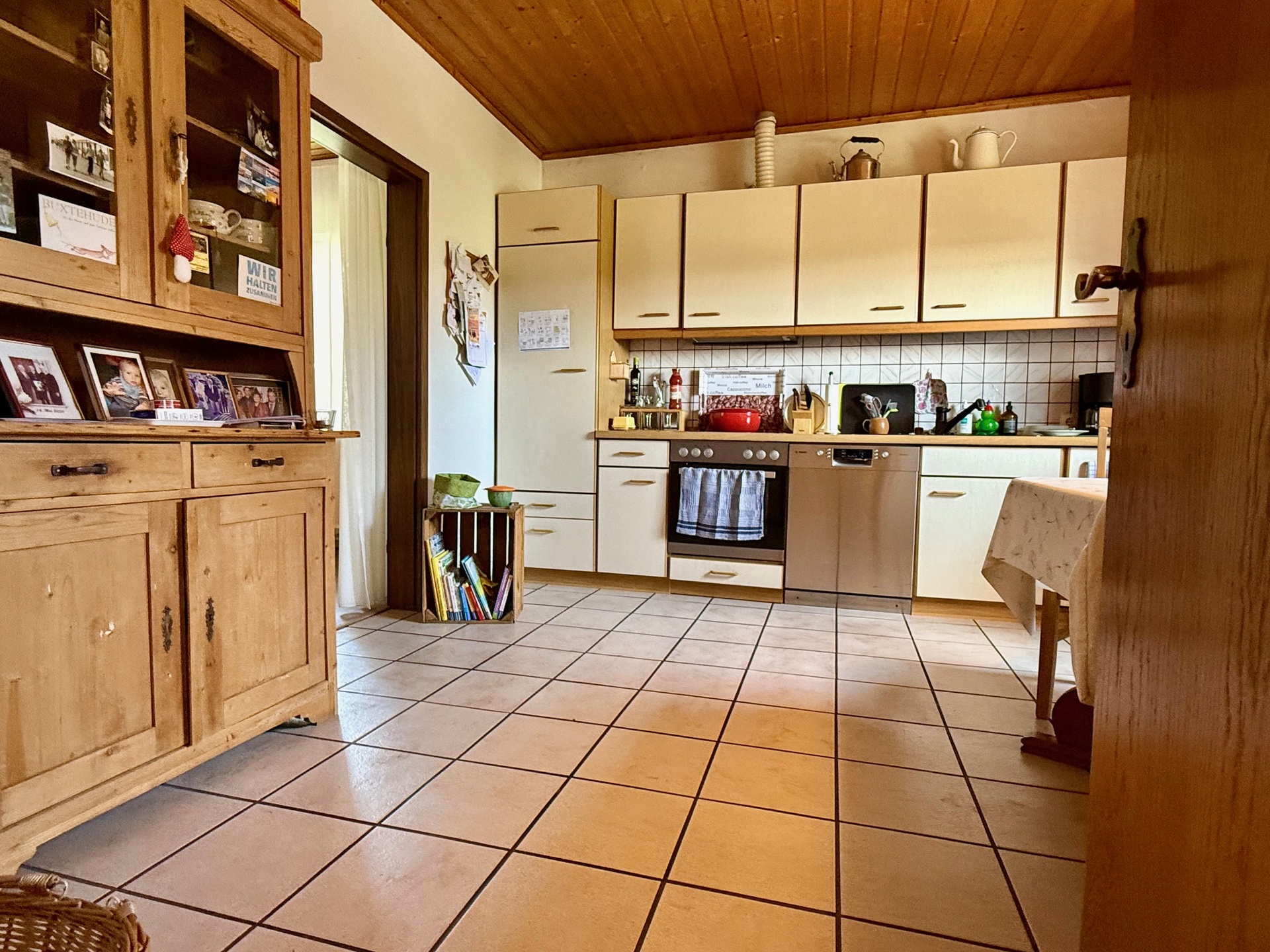 Früher existierte eine Verbindungstür über die Diele, die bei Bedarf wiederherstellbar ist. Ansonsten erfolgt der Zutritt derzeit über die etwa 20 m² große Wohnküche, die ebenso ausreichend Platz zum geselligen Beisammensein bietet und zum Verweilen einlädt.