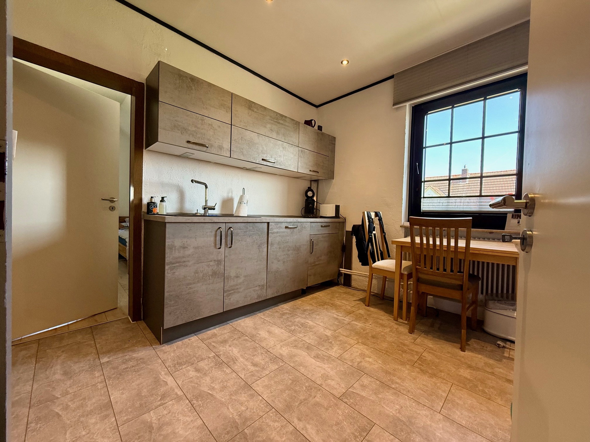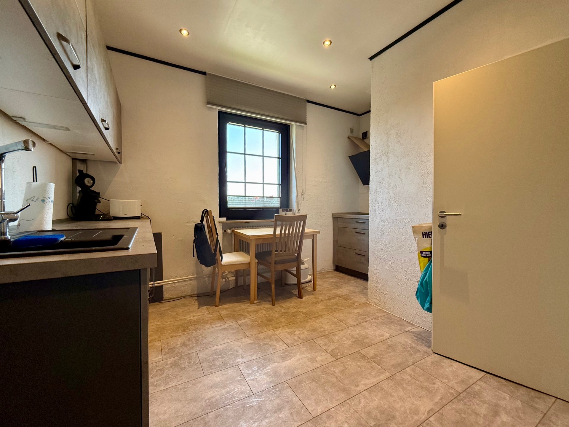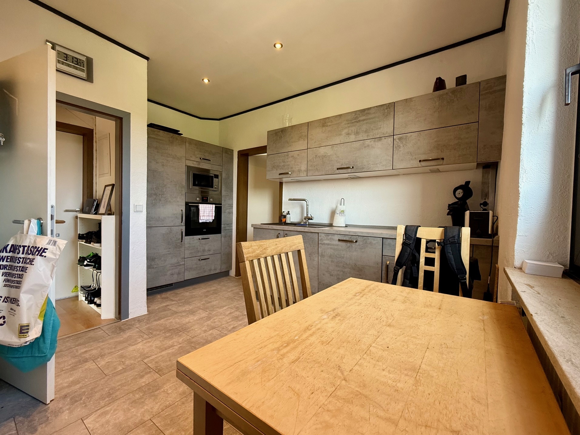 Früher existierte eine Verbindungstür über die Diele, die bei Bedarf wiederherstellbar ist. Ansonsten erfolgt der Zutritt derzeit über die etwa 20 m² große Wohnküche, die ebenso ausreichend Platz zum geselligen Beisammensein bietet und zum Verweilen einlädt.