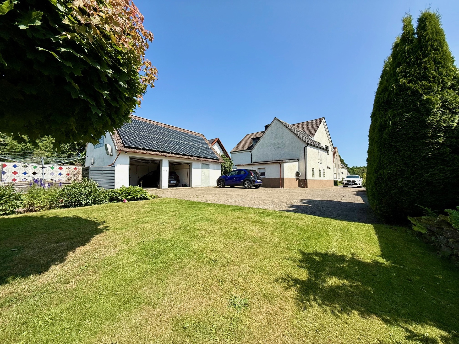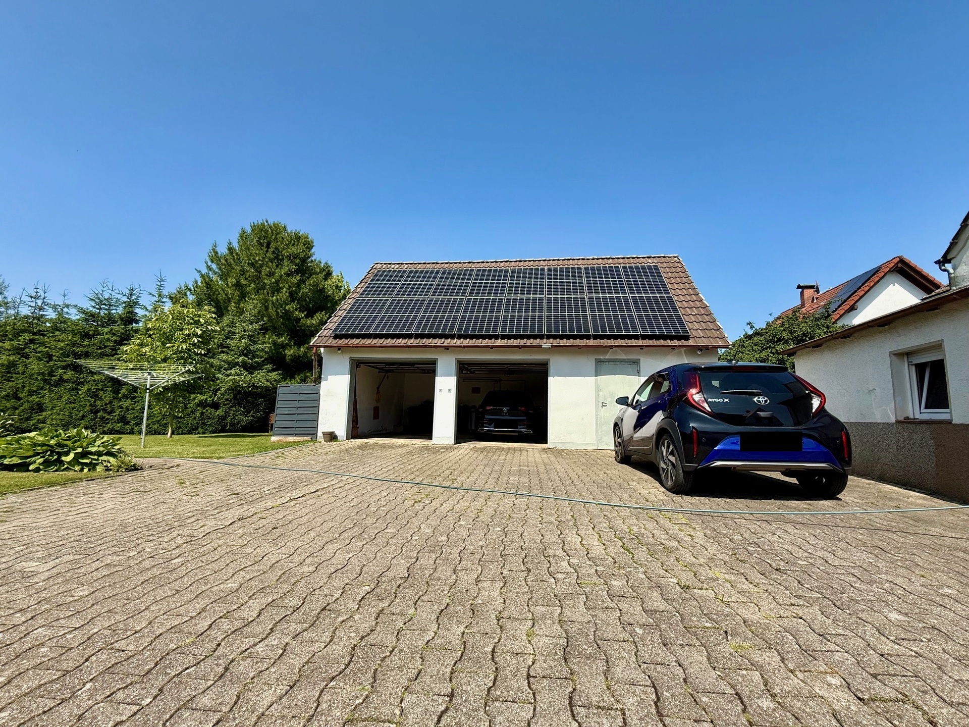 Ein separates Gebäude mit Doppelgarage mit elektrisch betriebenem Torantrieb und PV-Anlage auf dem Garagendach (32 Solarmodule) sowie mehreren Stellplatzmöglichkeiten davor bis zum Beginn der Einfahrt (für bis zu 6 PKW) vervollständigen das Gesamtgefüge.