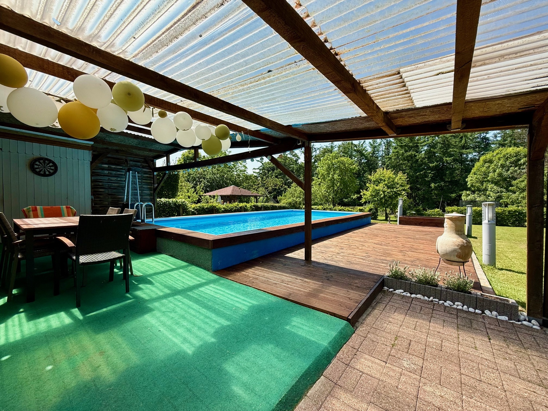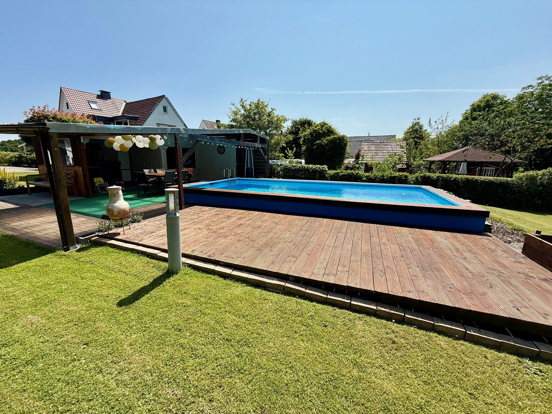Die dortige Relax-Zone ist wie geschaffen für laue Sommerabende und gesellige Grillpartys. Von hier aus erstreckt sich der idyllische Garten mit einer großzügigen Rasenfläche, einem erfrischenden Swimming-Pool (Länge: ca. 8,00 m – Breite: ca. 4,00 m – Tiefe: ca. 1,50 m) nebst Gartenhaus und Holz-Terrasse als Liegebereich sowie Hecken und Bäumen, die für Privatsphäre sorgen.