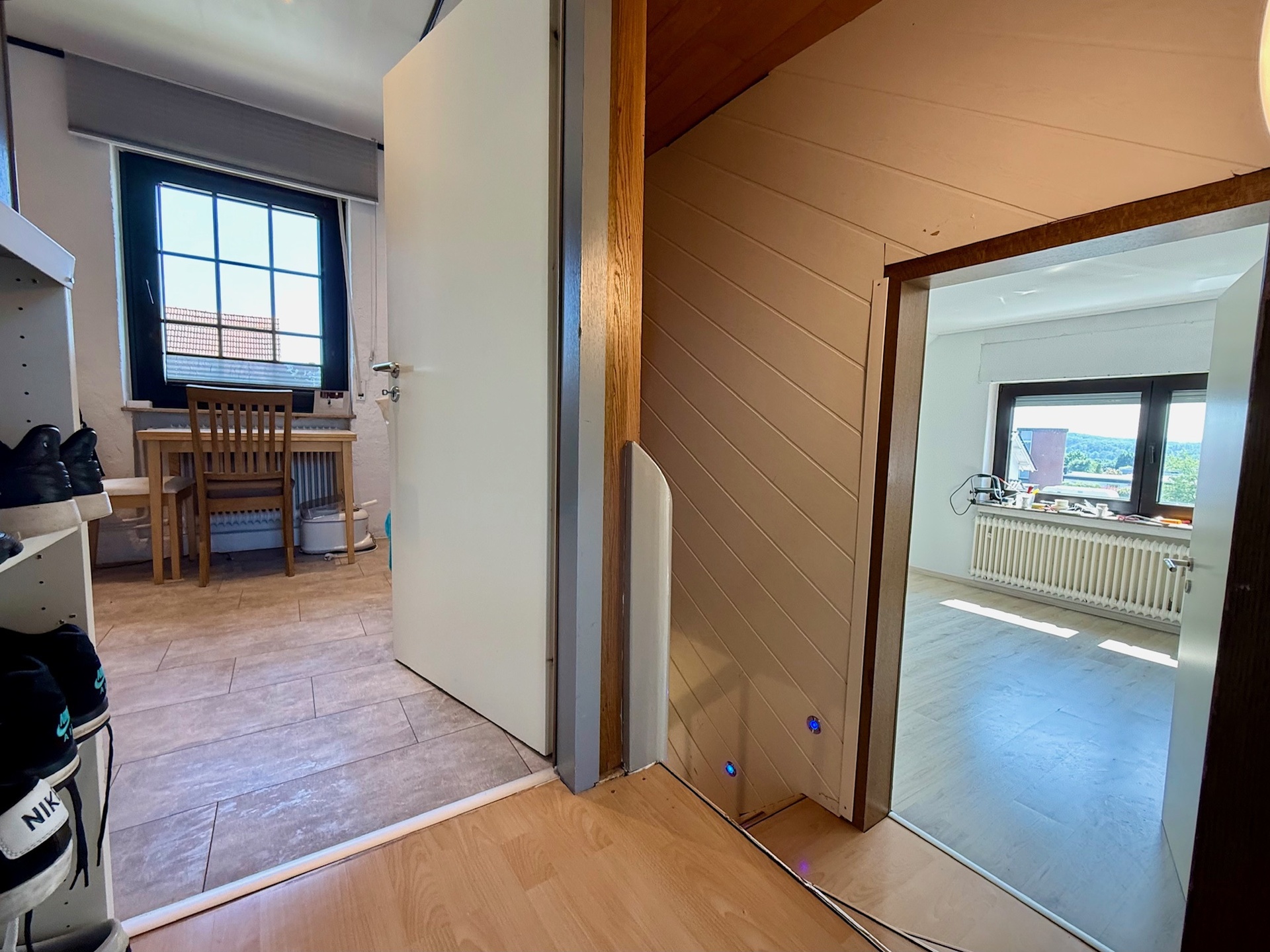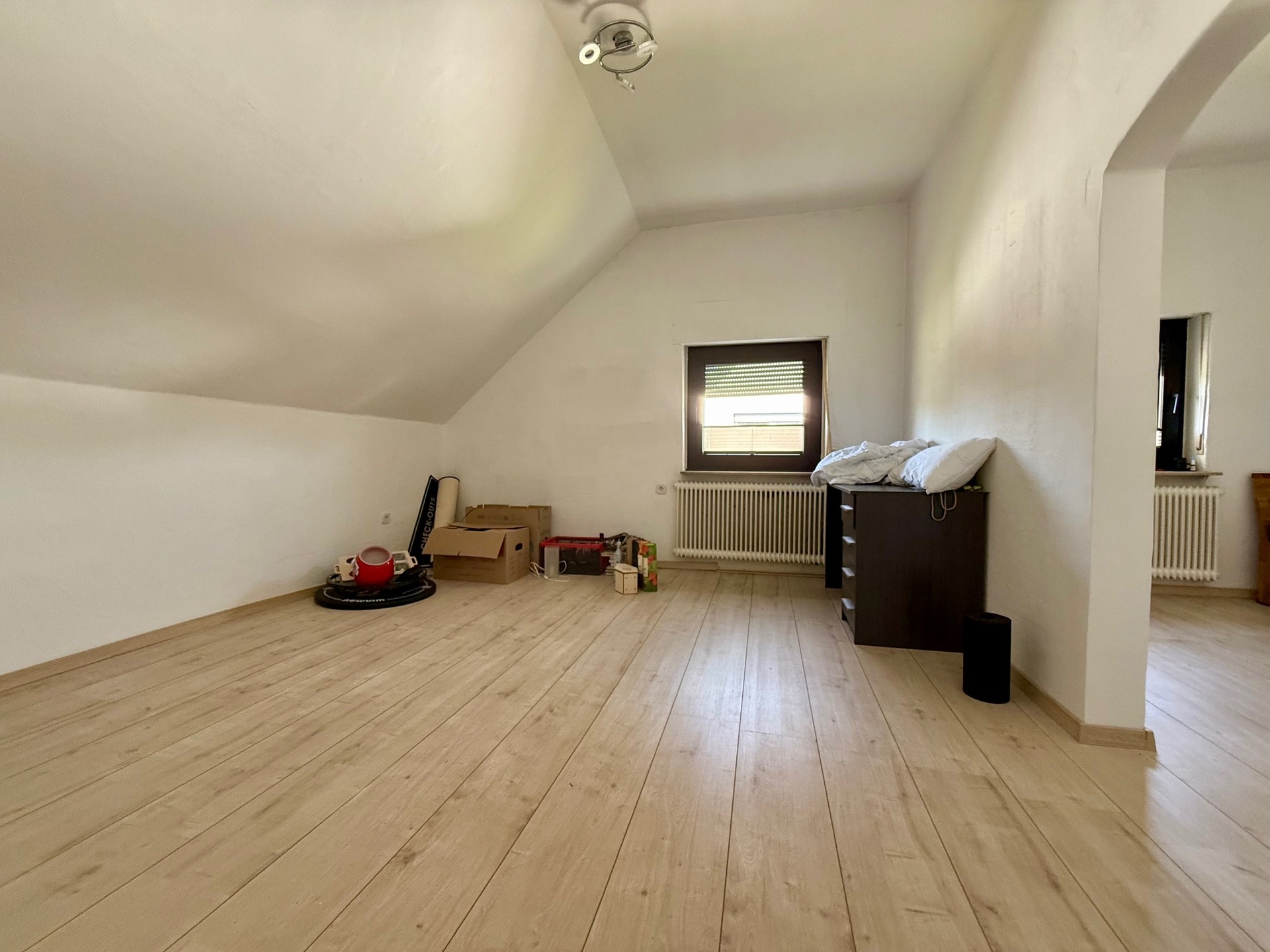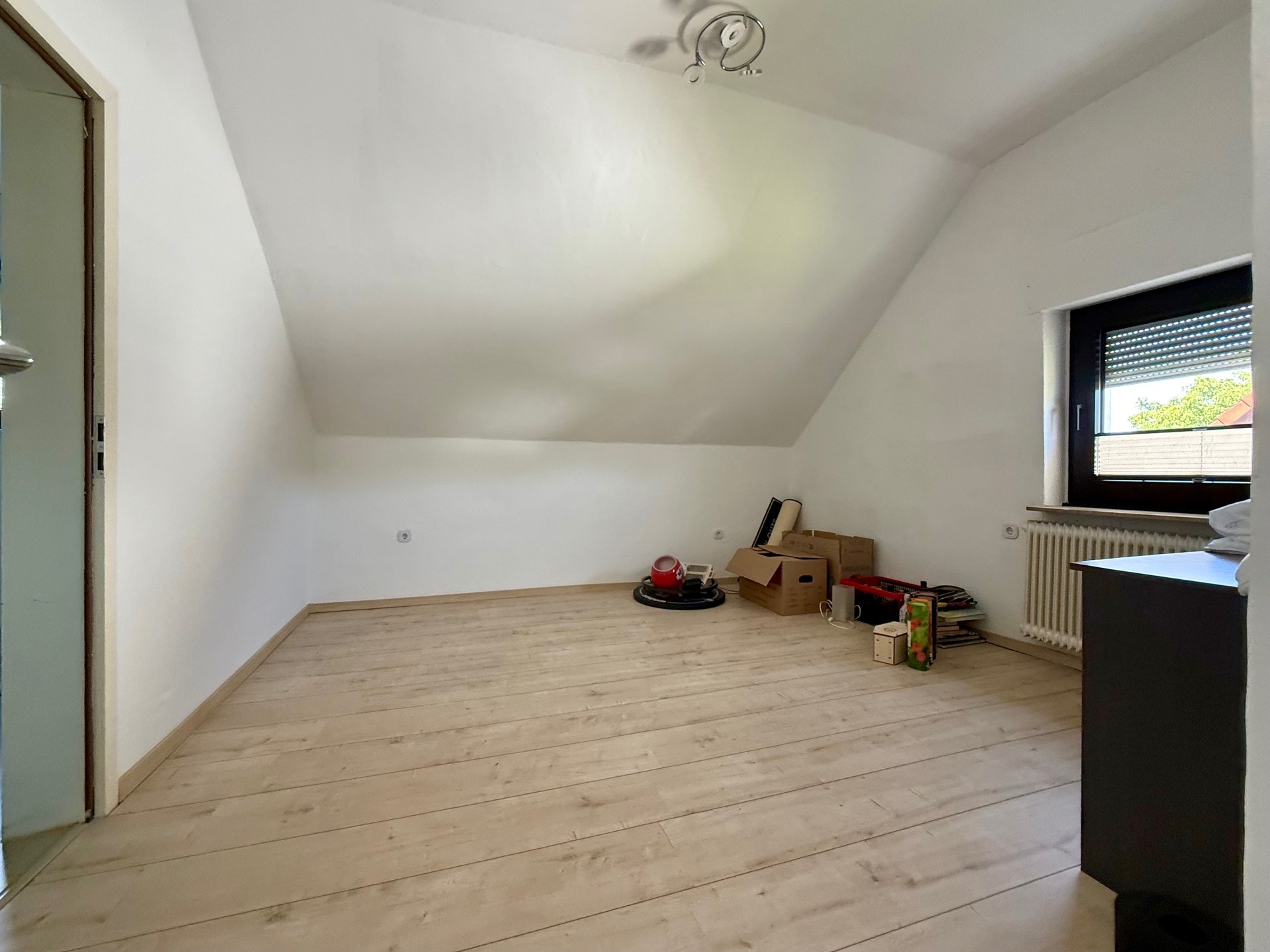 Gehen wir nun ganz nach oben in das Dachgeschoss: Hier finden Sie aktuell vier Schlafzimmer, die individuell genutzt werden können, und eine Küche. Ein Bad gibt es auf dieser Etage nicht, aber: Falls Sie die jetzige Küche (ca. 15 m² Grundfläche) nicht benötigen, wäre hier der Umbau in ein Badezimmer denkbar – je nach Nutzung würde das eventuell Sinn ergeben.
