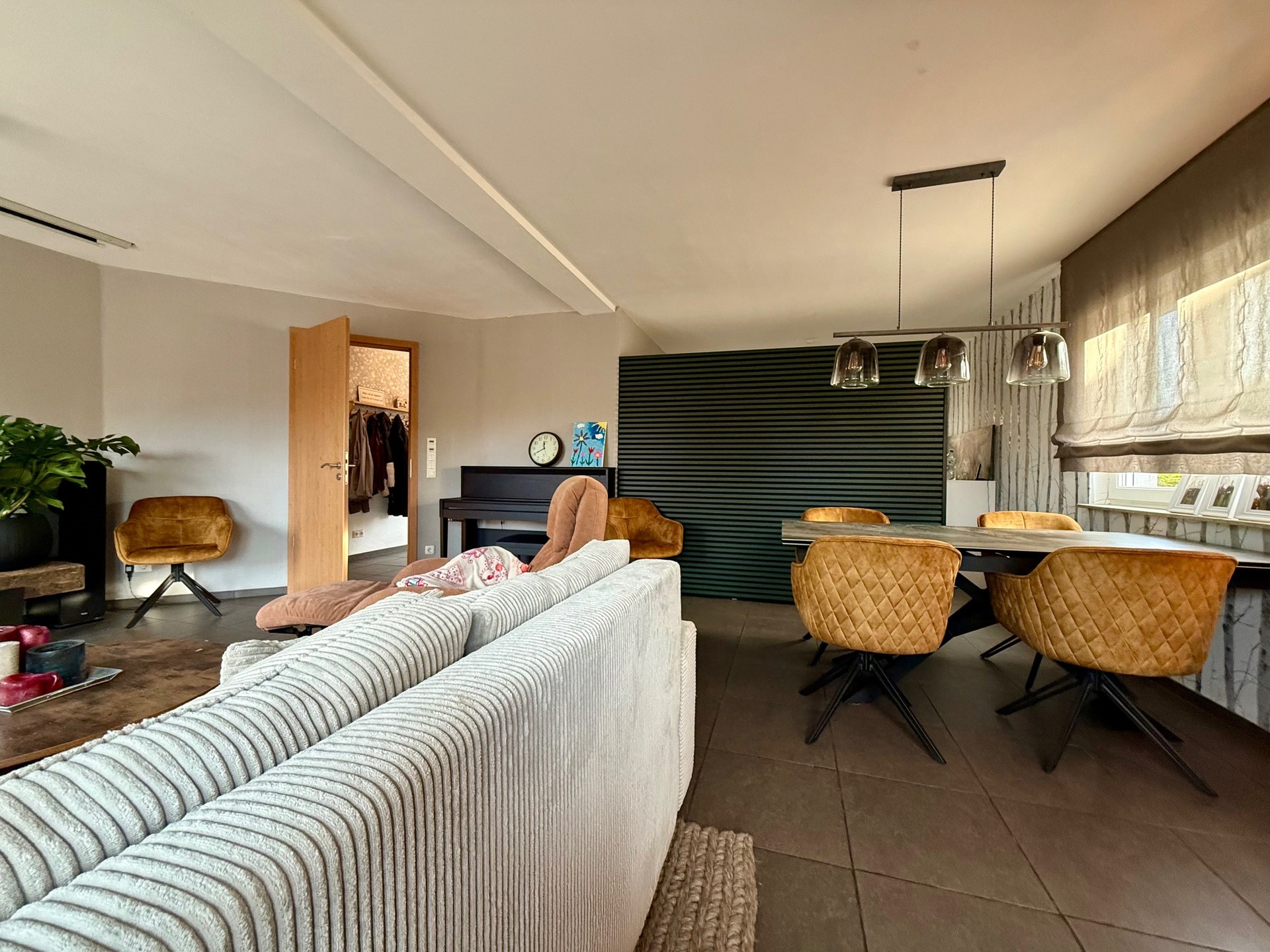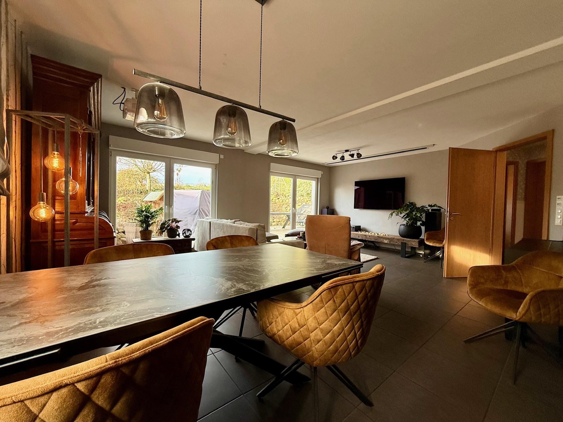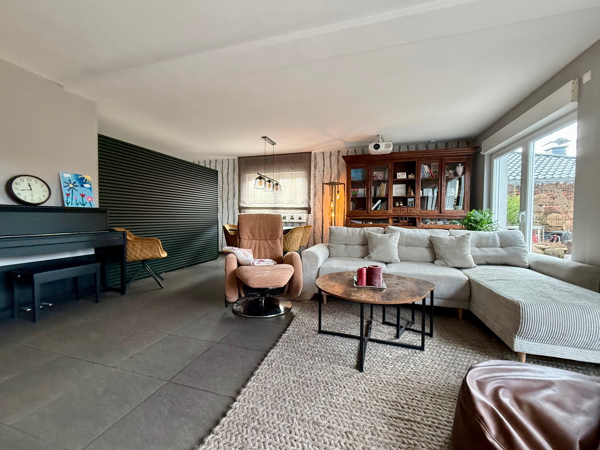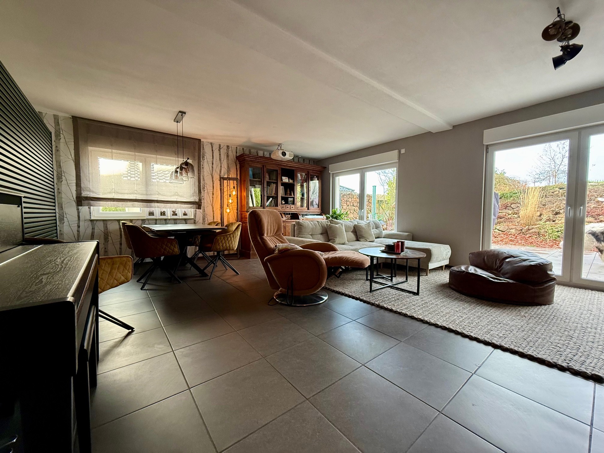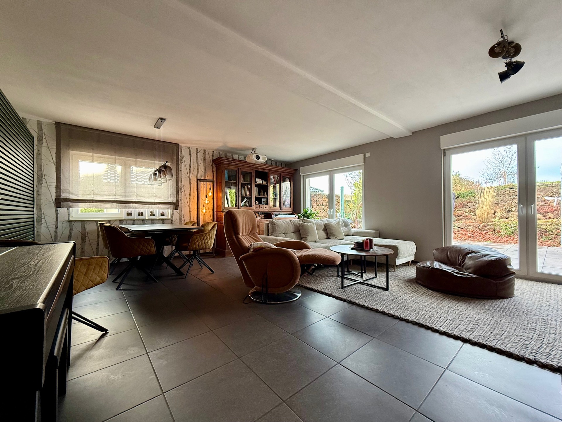 Zudem erwartet Sie im Erdgeschoss ein heller und einladender Wohn-/Essbereich von ca. 41 m². Große, bodentiefe Fenster schaffen eine harmonische Verbindung zur großzügigen Terrassenanlage und dem Gartenareal.