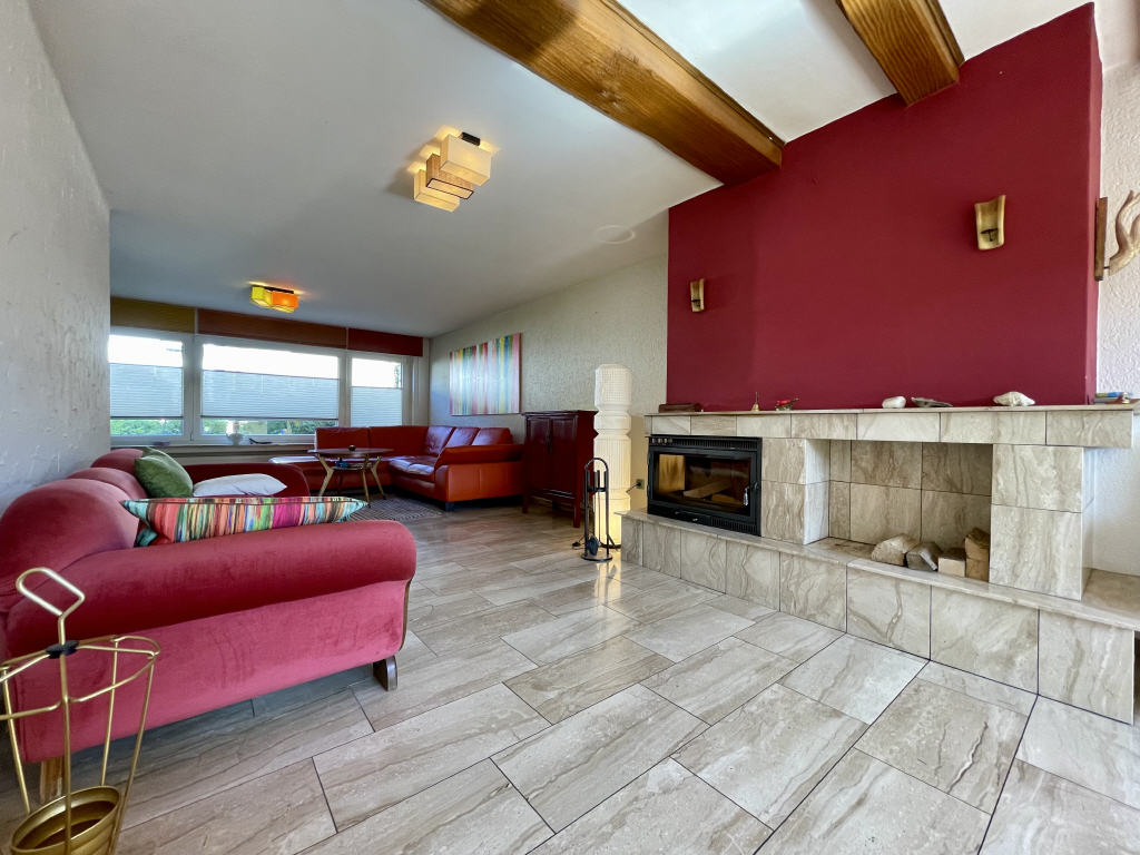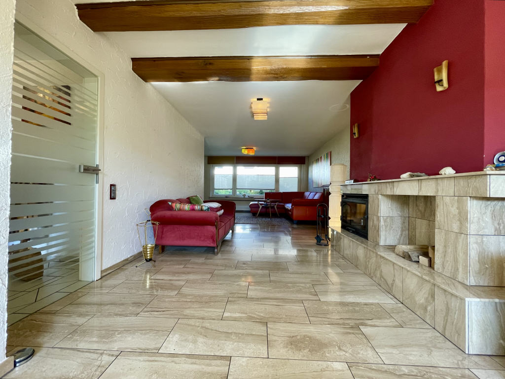 Der im fast 47 m² großen Wohn-/Esszimmer befindliche Innenkamin mit Kassettensystem sorgt für knisternde Stimmung und behagliche Atmosphäre bei kalten Außentemperaturen. Zudem haben Sie von hier aus Zugang zur Terrasse und zum Garten.