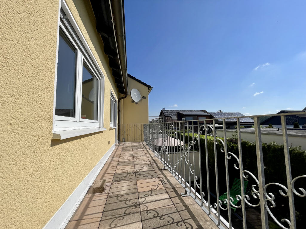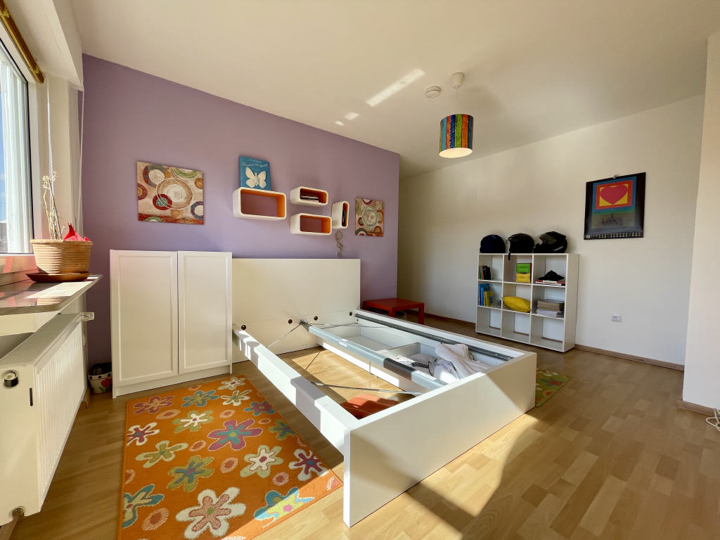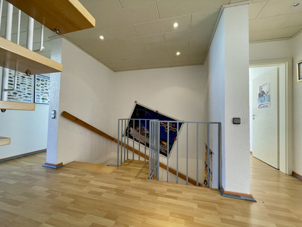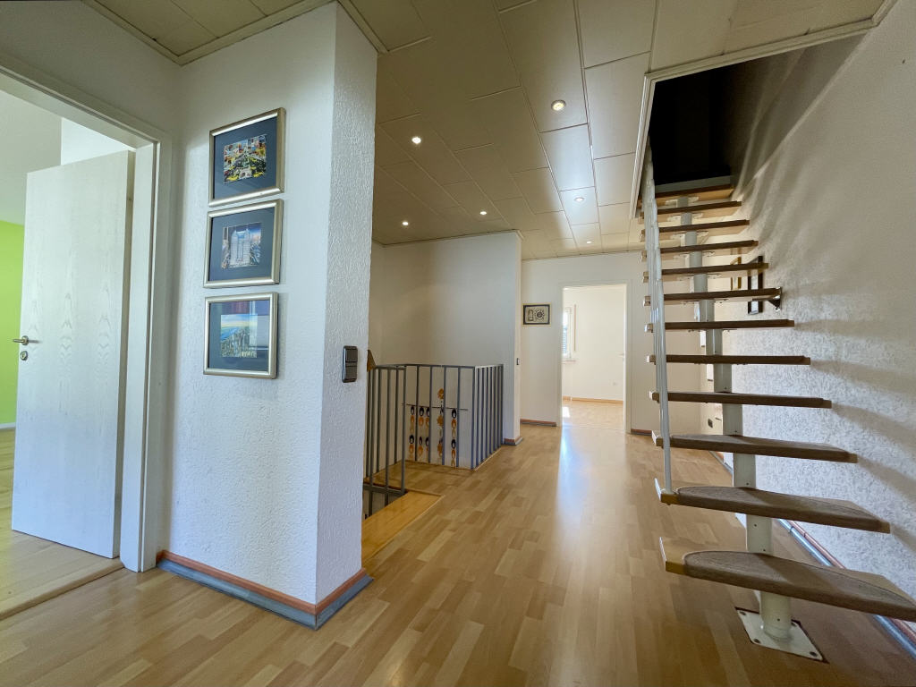 Diese Ebene präsentiert sich neben dem luftigen Flurbereich mit drei Schlafräumen (einer davon mit begehbarem Kleiderschrank) sowie einem Tageslichtbad mit Eckdusche/Waschbecken/WC.