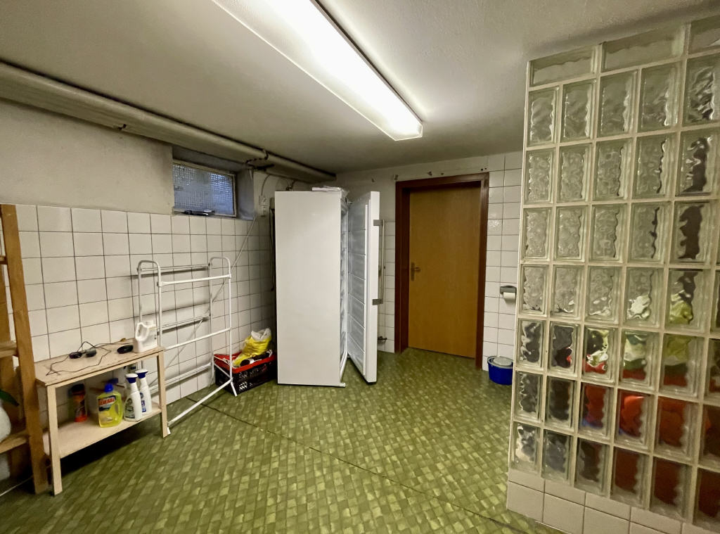 Es existieren drei Kellerräume plus Heizungsraum. Im ersten Raum befindet sich eine original Knüllwald-Sauna nebst Anschlussmöglichkeiten für eine Wanne oder Dusche. Der zweite Raum bietet Möglichkeiten zum Waschen und Trocknen sowie eine Dusche (optisch aus den 1970er-Jahren). Komplettiert wird das Geschoss durch einen großzügigen Kellerabstellraum.