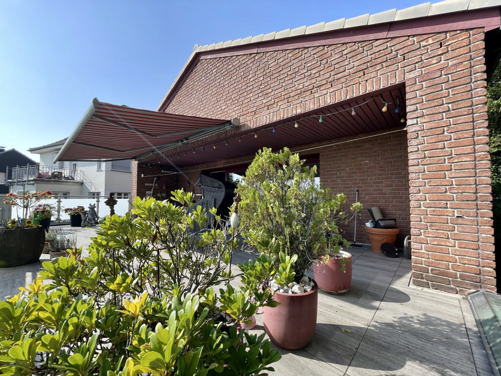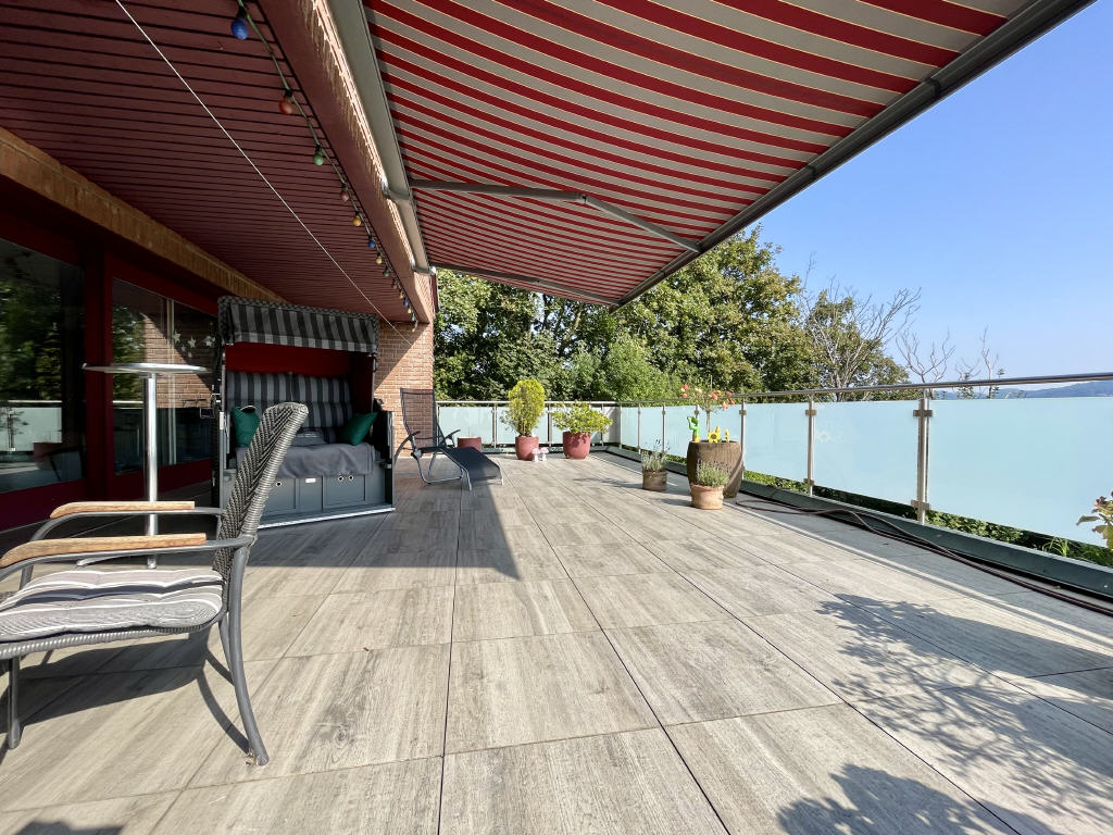 Der mit einem Steinfliesenboden in Holzoptik ausgestattete Dachgarten mit seiner stattlichen Größe von etwa 56 m² bietet in Form einer Terrassenanlage – neben seiner wunderbaren Aussicht – weitere tolle Gelegenheiten zum Relaxen und geselligem Beisammensein an.