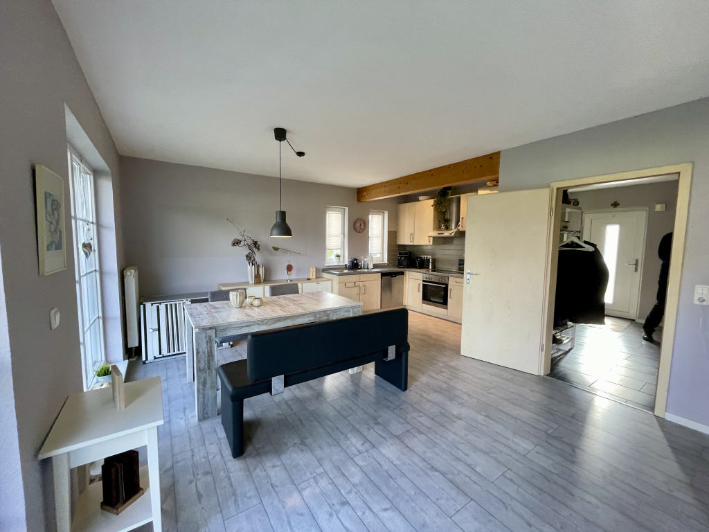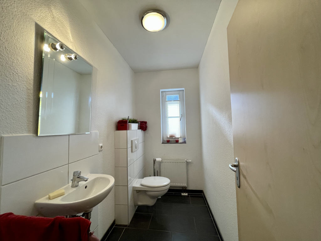 Im Erdgeschoss erwarten Sie ein großer Wohn-/Essbereich (ca. 34 m²) mit offener Wohnküche und Kaminofen, die Eingangsdiele, ein Gäste-WC mit Fenster sowie ein Hauswirtschaftsraum, wo u. a. die Heizung und sämtliche Hausanschlüsse untergebracht sind.