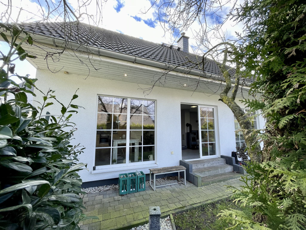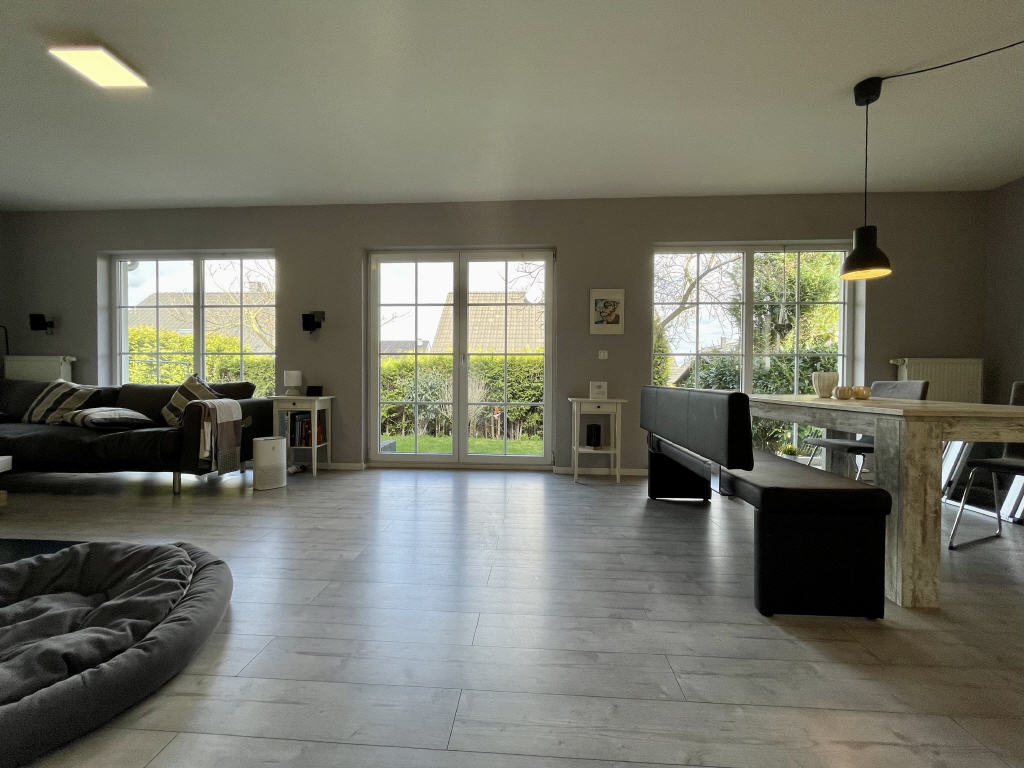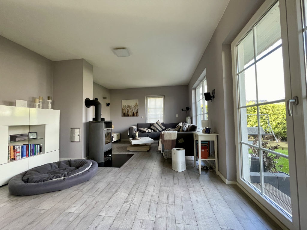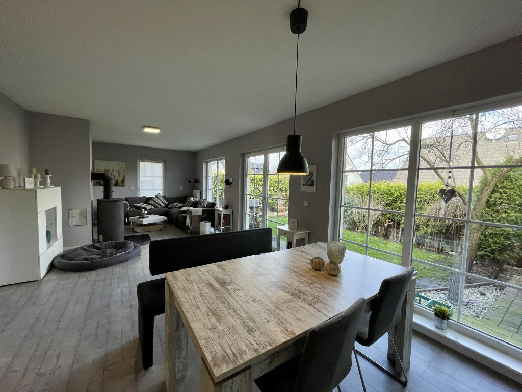 Zur Gartenseite hin sorgen die bodentiefen Fensterfronten im Wohn-/Essbereich für ein positives tageslichtbeleuchtetes Raumklima.